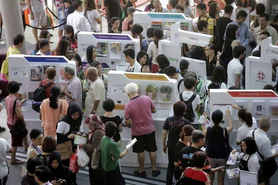 ஸ்கில்ஸ்ஃபியூச்சர் கண்காட்சியில் பல்வேறு பயிற்சி வகுப்புகள் பற்றிய விவரங்களை மக்கள் தெரிந்துகொள்கின்றனர். படம்: ஸ்ட்ரெய்ட்ஸ் டைம்ஸ்