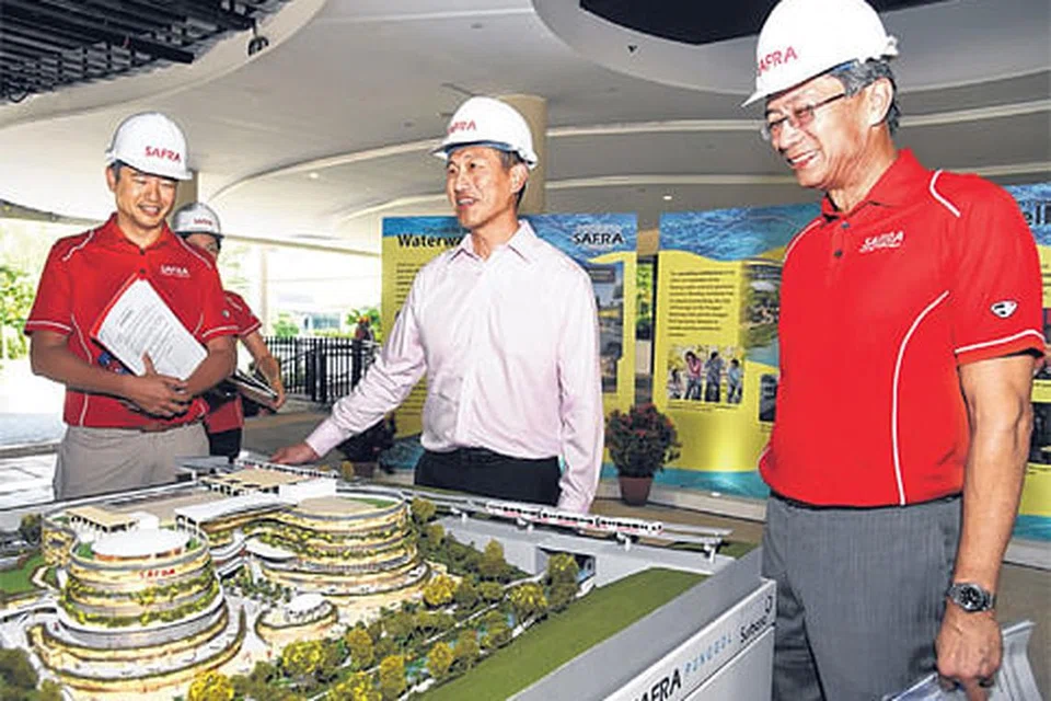 சாஃப்ரா பொங்கோல் மேம்பாட்டுக் குழுத் தலைவர் திரு டேரன்ஸ் குவேக் (இடது), சாஃப்ரா தலைமை நிர்வாக அதிகாரி திரு எட்வர்ட் லியோங் (வலது) ஆகியோருடன் சாஃப்ரா பொங்கோலின் கட்டட மாதிரியைப் பார்வையிடுகிறார் சாஃப்ராவின் தலைவர் திரு ஓங் யி காங் (நடுவில்). படம்: சாஃப்ரா