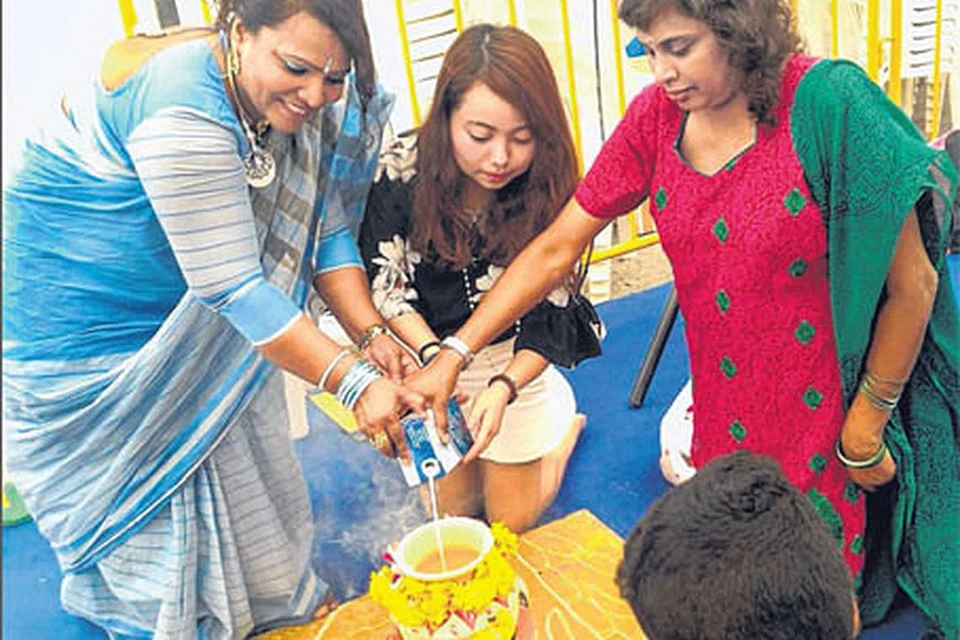 நேற்று நடைபெற்ற கூட்டுப் பொங்கல் வைக்கும் நிகழ்ச்சியில்சீனப் பெண்மணியுடன் பல இனத்தவரும் பங்கேற்றனர். படம்: லிஷா