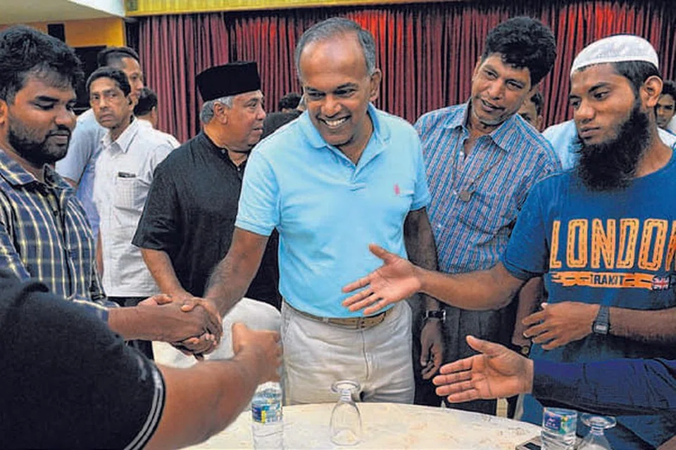 கதிஜா பள்ளிவாசலுக்கு வந்திருந்த பங்ளாதேஷ் ஊழியர்களிடம் உரையாடும் சட்ட, உள்துறை அமைச்சர் கா. சண்முகம். படம்: ஸ்ட்ரெய்ட்ஸ் டைம்ஸ்