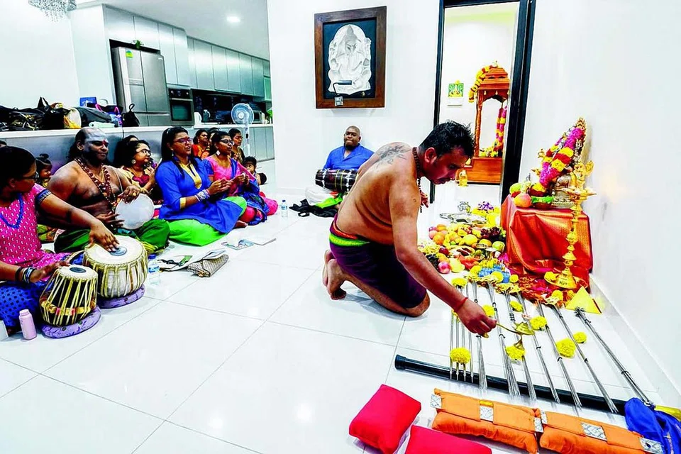 காவடிக்கான வழிபாட்டை திரு பிரித்தீவ் ராஜ் (வலது) நேற்று முன்தினம் தமது வீட்டில் நடத்தினார். காவடி உபகரணங்கள், அலகுகள் போன்றவற்றை முருகக் கடவுளுக்கு முன் வைத்து அவர் வணங்கினார். படம்: த. கவி