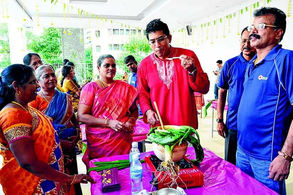 பொங்கல் வைத்த குடியிருப்பாளர்களின் பொங்கலை ருசித்துப் பார்க்கும் அங் மோ கியோ குழுத் தொகுதி நாடாளுமன்ற உறுப்பினர் டேரல் டேவிட் (இடமிருந்து மூன்றாவது). படங்கள்: சி யுவான் சமூக மன்ற இந்தியர் நற்பணிச் செயற்குழு