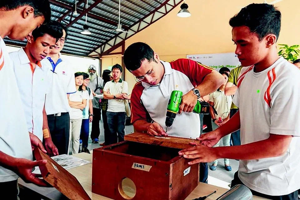 புதிய மையத்தில் ஐடிஇ ஈஸ்ட் மாணவர்களுடன் இணைந்து Blue--throated Bee--eater எனும் பறவை வகைக்குக் கூடாகத் திகழக்கூடிய பெட்டியைச் செய்கிறார் மூத்த துணை அமைச்சர் டெஸ்மண்ட் லீ (நடுவில்). படம்: தேசிய பூங்காக்கள் வாரியம்
