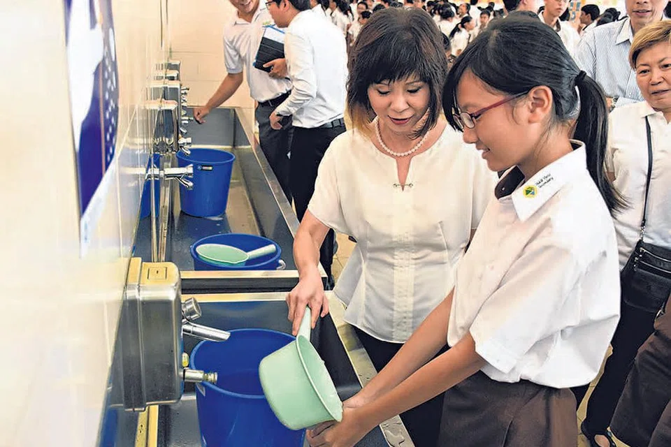 தண்ணீரின் முக்கியத்தை உணர்த்தி அதை விரயமாக்காமல் அளவோடு, சிக்கனமாக, விவேகமாகப் பயன்படுத்த வேண்டும் என்பதைப் பள்ளிக்கூட மாணவ, மாணவியருக்கு எடுத்துச் சொல்லிப் போதிக்க நேற்று தண்ணீர் பங்கீட்டுப் பயிற்சி நடந்தது. புக்கிட் வியூ உயர்நிலைப் பள்ளிக்கூடத்தில் நடந்த பயிற்சியில் சுற்றுப்புற, நீர்வள மூத்த துணை அமைச்சர் டாக்டர் ஏமி கோர் கலந்துகொண்டு மாணவ, மாணவியருக்குச் செய்முறைப் பயிற்சி மூலம் போதித்தார். படம்: ஸ்ட்ரெய்ட்ஸ் டைம்ஸ்