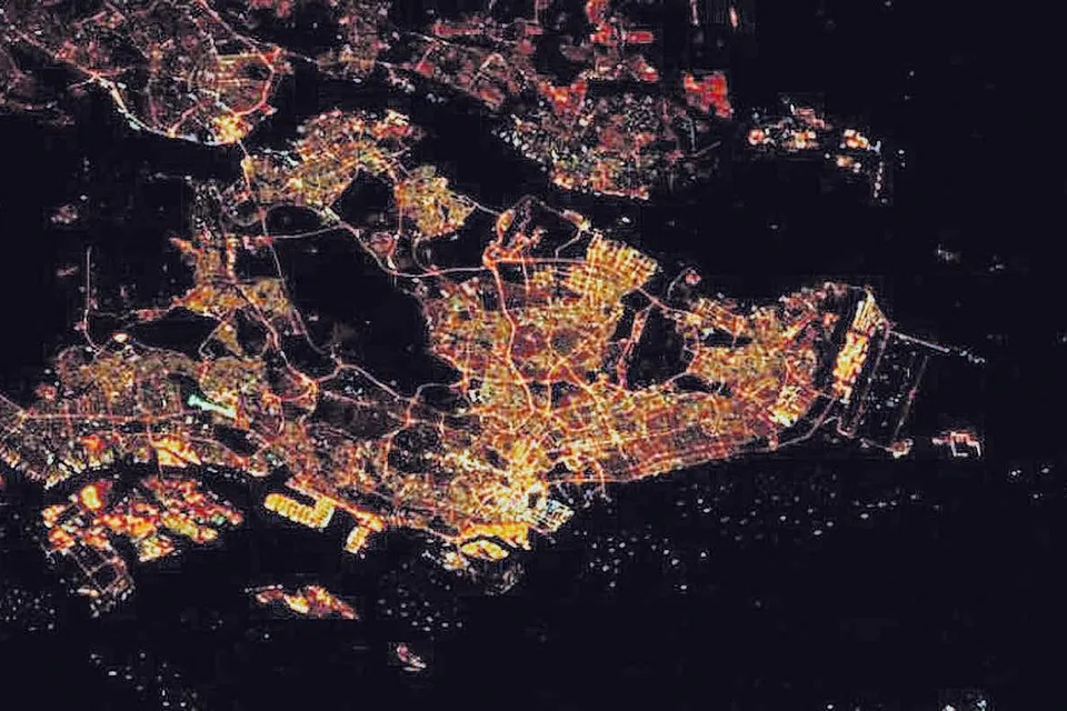 மஞ்சள் நிற விளக்குகள் பின்னிப்பிணைந்து ஒன்றோடு ஒன்று இணைந்து பிரம்மாண்ட மான ஒரு கட்டமைப்பாக இந்தப் படத்தில் சிங்கப்பூர் காணப்படு கிறது. மத்திய நீர்த்தேக்க காட் டுப் பகுதி இருண்டு காணப்படு கிறது. அமெரிக்க விண்வெளி வீர ரான டீம் கோப்ராவுக்கு வயது 52. அவர் சென்ற ஆண்டு டிசம்பரில் அனைத்துலக விண்வெளி நிலை யத்தின் தளபதியாகப் பொறுப்பு எடுத்துக்கொண்டார். புதுடெல்லி, பெய்ஜிங், நியூயார்க், துபாய் ஆகிய நகரங்களை இரவு நேரத்தில் காட்டும் படங் களையும் அவர் டுவிட்டரில் பகிர்ந்துகொண்டிருக்கிறார். கலிபோர்னியா, ஹோனலுலு, ரீயோ டீ ஜெனிரோ ஆகிய நகரங் களைப் பகல் நேரத்தில் மேலிருந்து காட்டும் படங்களையும் இவர் அனுப்பி இருக்கிறார்.