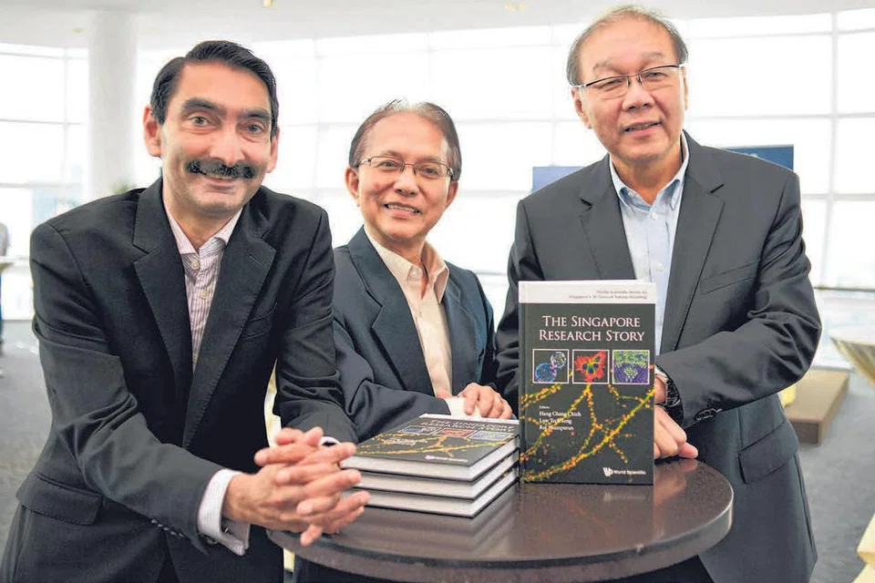 'தி சிங்கப்பூர் ரிசர்ச் ஸ்டோரி' நூலை எழுதிய (இடமிருந்து வலம்) ராஜ் தம்பூரன், பேராசிரியர் ஹங் சாங் சீயே, பேராசிரியர் லோ தெக் செங். படம்: ஸ்ட்ரெய்ட்ஸ் டைம்ஸ்