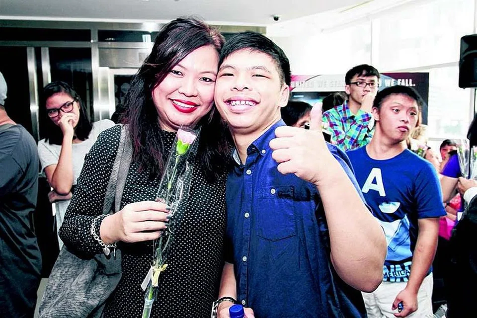 சிறப்பு ஒலிம்பிக் போட்டிகளில் சிங்கப்பூரைப் பிரதிநிதித்த போட்டியாளர் ஒருவர் தம் தாயாருக்கு மலர் கொடுத்து நன்றி கூறினார். படம்: போர்ட்டர்நோவெல்லி
