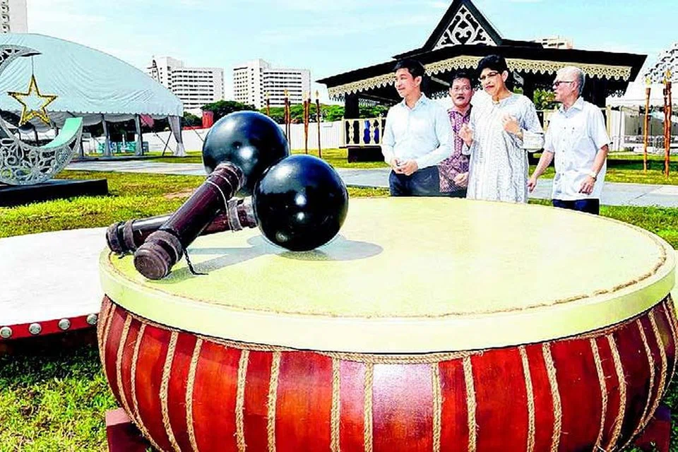 முன்னாள் மலாய் கிராமம் இருந்த இடத்தில் காட்சிக்கு வைக்கப் பட்டிருக்கும் மலாய் பாரம்பரிய காட்சிப் பொருட்களைப் பார்வையிடுகின்றனர் நோன்புப் பெருநாள் ஒளியூட்டுக் குழு 2016ல் அங்கம் வகிக்கும் சமுதாய, குடும்ப மேம்பாட்டு அமைச்சர் டான் சுவான் ஜின் (இடக்கோடி), மரீன் பரேட் குழுத் தொகுதி நாடாளுமன்ற உறுப் பினர் டாக்டர் ஃபாத்திமா லத்தீஃப் (இடமிருந்து 3வது). படம்: பெரித்தா ஹரியான்