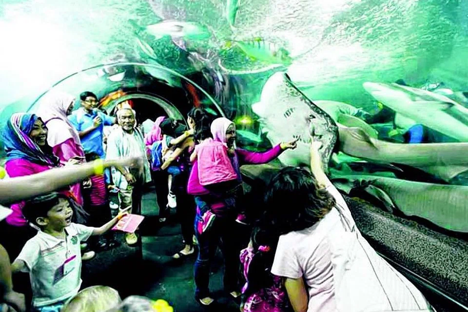 'அண்டர்வாட்டர் வோர்ல்ட் சிங்கப்பூர்' நீர்க் காட்சியகத்தில் உள்ள நீருக்கடிச் சுரங்கத்தில் வருகையாளர்கள் தங்களுக்கு மேலும் பக்கத்திலும் நீந்தும் மீன்களைப் பார்த்து பரவசமடைகின்றனர். கோப்புப் படம்