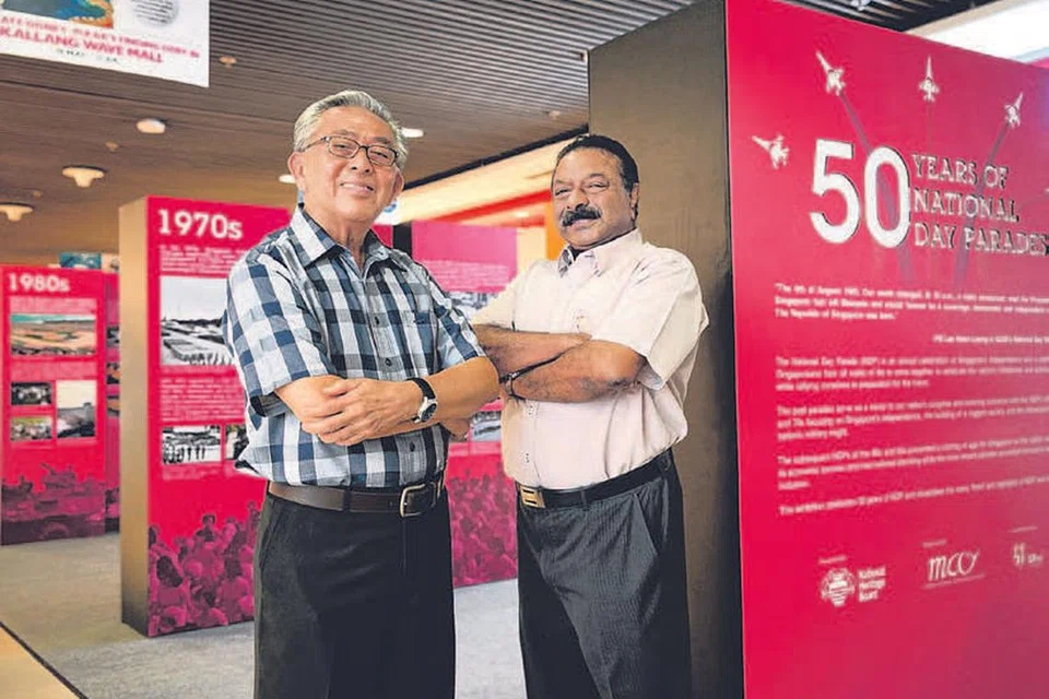தேசிய தின அணிவகுப்பு தொடங்கிய காலகட்டத்தில் அதில் பங்கெடுத்த திரு ஹோங் செங் மாக் (இடம்), திரு பொன்னுசாமி. படம்: ஸ்ட்ரெய்ட்ஸ் டைம்ஸ்