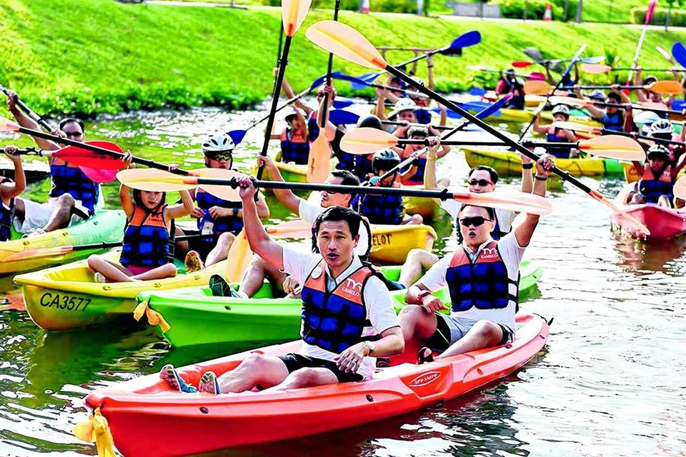 நேற்று நடைபெற்ற பொங்கோல் நீர்வழிச் சவால் படகு வலித்தல் நிகழ்ச்சியில் பங்கேற்ற அமைச்சர் ஓங் யி காங் (முதல் படகு, இடப்பக்கம்) படகு வலித்தல் போன்ற உடலுறுதிக்குச் சவால் விடும் போட்டிகளில் அதிகமானோர் பங்கேற்பது உற்சாகமளிக்கிறது என்றார். படம்: அமைச்சர் ஓங் ஃபேஸ்புக்