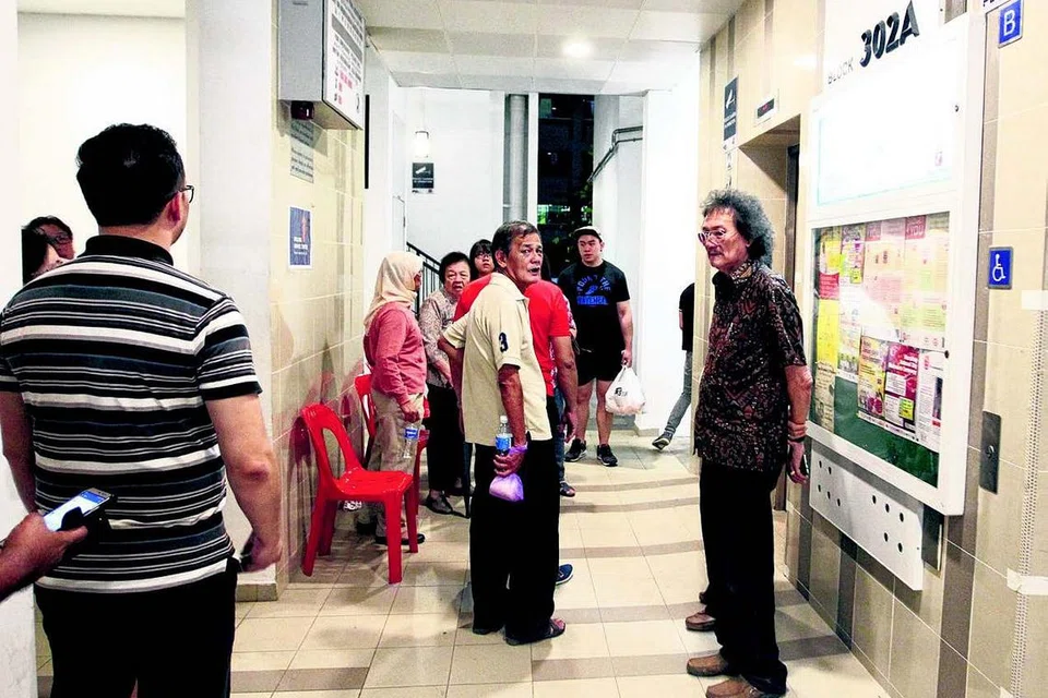 உட்லண்ட்ஸ் ஸ்திரீட் 32ல் உள்ள புளோக் 302ஏ=ன் மூன்று மின்தூக்கிகளும் நேற்று முன்தினம் இரவு நான்கு மணி நேரத்துக்கு செயல்படாமல் நின்று போன தால் அந்த புளோக்கின் குடியிருப்பாளர்கள் அவதிக்கு ஆளாகினர். மாலை 6 மணி முதல் இரவு 10 மணி வரை மின்தூக்கிகள் செயல்படவில்லை என அந்தக் கட்டடத்தின் 32வது மாடியில் குடியிருக்கும் ஒருவர் தெரிவித்தார். 21வது மாடியில் குடியிருக்கும் ஒருவருக்கு 'பேஸ்மேக்கர்' கருவி பொருத்தப்பட்டிருப்பதால் மாடிப்படிகளேறி வீடு செல்ல விருப்பமின்றிக் காத்திருந்தார். காத்திருந்தோருக்காக நகர மன்றம் இருக்கைகளை ஏற்பாடு செய்தது. இரவு 9 மணிவாக்கில் நாடாளுமன்ற நாயகர் ஹலிமா யாக்கோப் அங்கு வந்து குடியிருப்பாளர்களுடன் உரையாடினார். படம்: ஷின் மின்