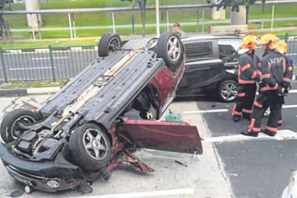 கார், லாரி ஆகியவற்றுடன் மோதி விபத்துக்குள்ளானதில் தலைகீழாகக் கவிழ்ந்த கார். படம்: ஸ்டோம்ப்