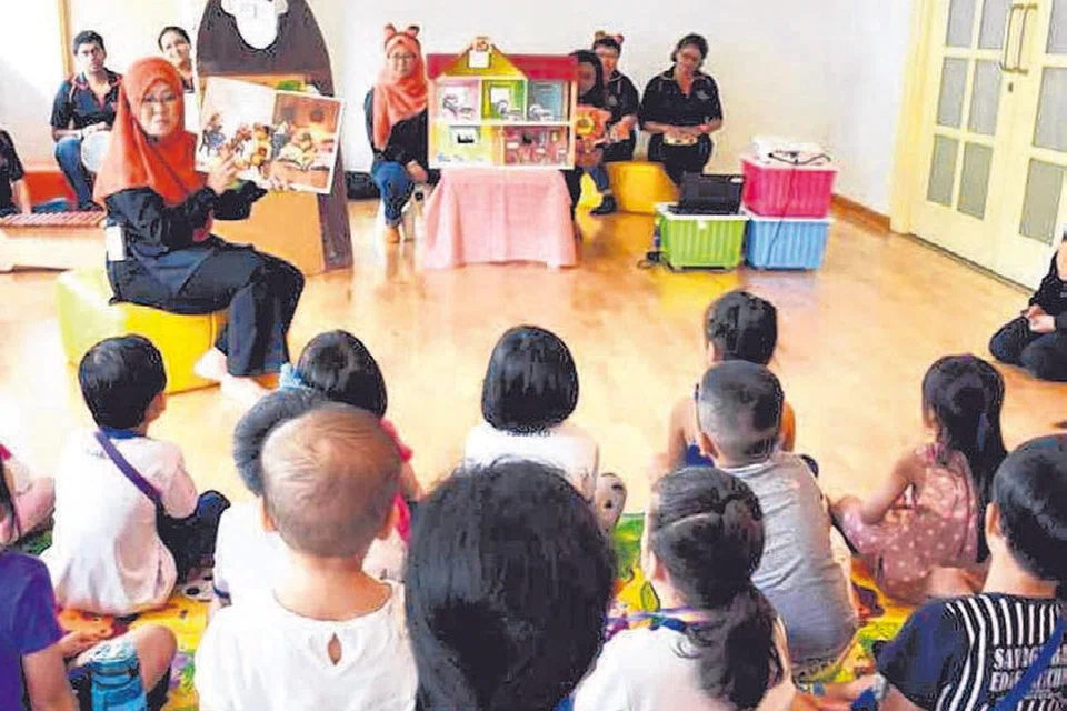 வடகிழக்கு சமூக மேம்பாட்டு மன்றத்தின் விளையாட்டுப் பொருள் நூலகத்தில் கதை சொல்லும் நிகழ்ச்சியில் பங்கேற்கும் சிறப்பு தேவையுடைய பிள்ளைகள் கூறப்படும் கதையை ஆர்வத்துடன் கேட்கின்றனர். படம்: ஸ்ட்ரெய்ட்ஸ் டைம்ஸ்