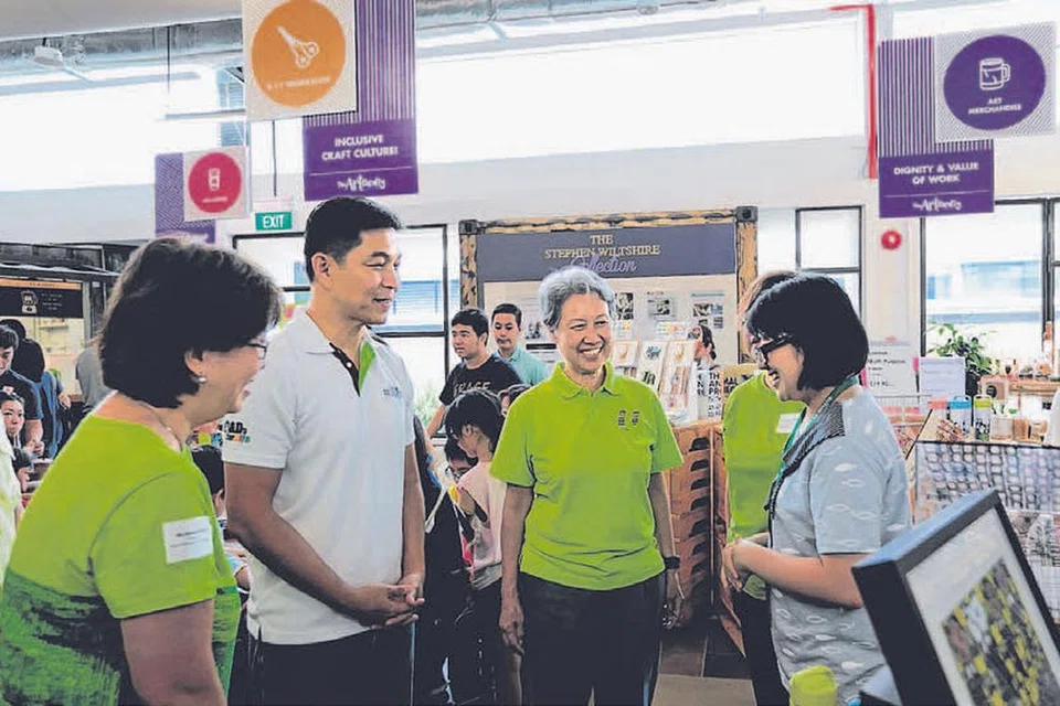 ஆட்டிஸம் வள நிலைய ஊழியருடன் (வலக்கோடி) உரையாடும் (இடமிருந்து) ஆட்டிசம் வள நிலையத்தின் தலைவரும் ஆட்டிஸம் கழகத்தின் உறுப்பினருமான திருவாட்டி டென்னிஸ் புவா, அமைச்சர் டான் சுவான் ஜின், திருமதி ஹோ சிங். படம்: பாத்லைட் பள்ளி