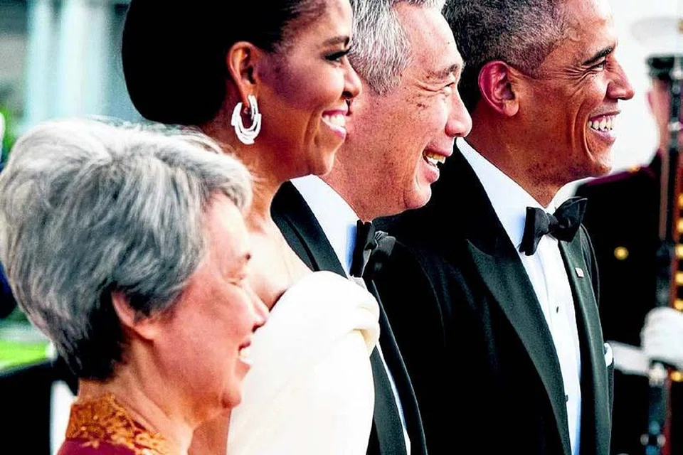 வெள்ளை மாளிகை விருந்து நிகழ்வின்போது அதிபர் ஒபாமா தம்பதியருடன் பிரதமர் லீ சியன் லூங் தம்பதியினர். படம்: ஏஎஃப்பி