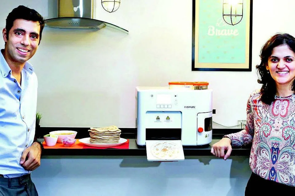 சப்பாத்தி, ரொட்டி தயாரிக்கும் 'ரொட்டிமேட்டிக்' இயந்திரத்துடன் அதை உருவாக்கிய தம்பதியர் திருமதி பிரனோத்தி நாகர்கர் (வலது) - திரு ரிஷி இஸ்ரானி.