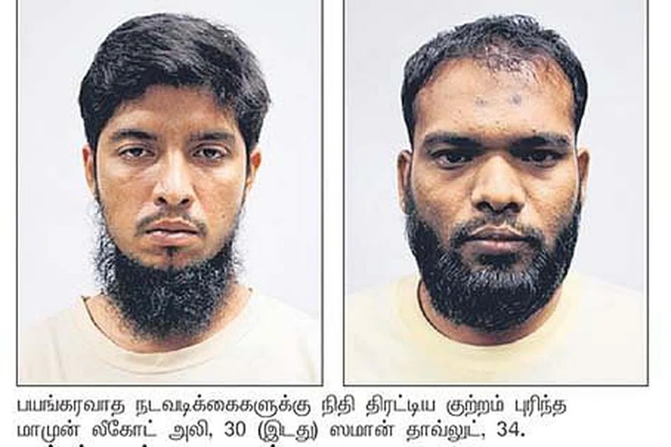 பயங்கரவாத நடவடிக்கைகளுக்கு நிதி திரட்டிய குற்றம் புரிந்த மாமுன் லீகோட் அலி, 30 (இடது) ஸமான் தாவ்லுட், 34. படங்கள்: உள்துறை அமைச்சு