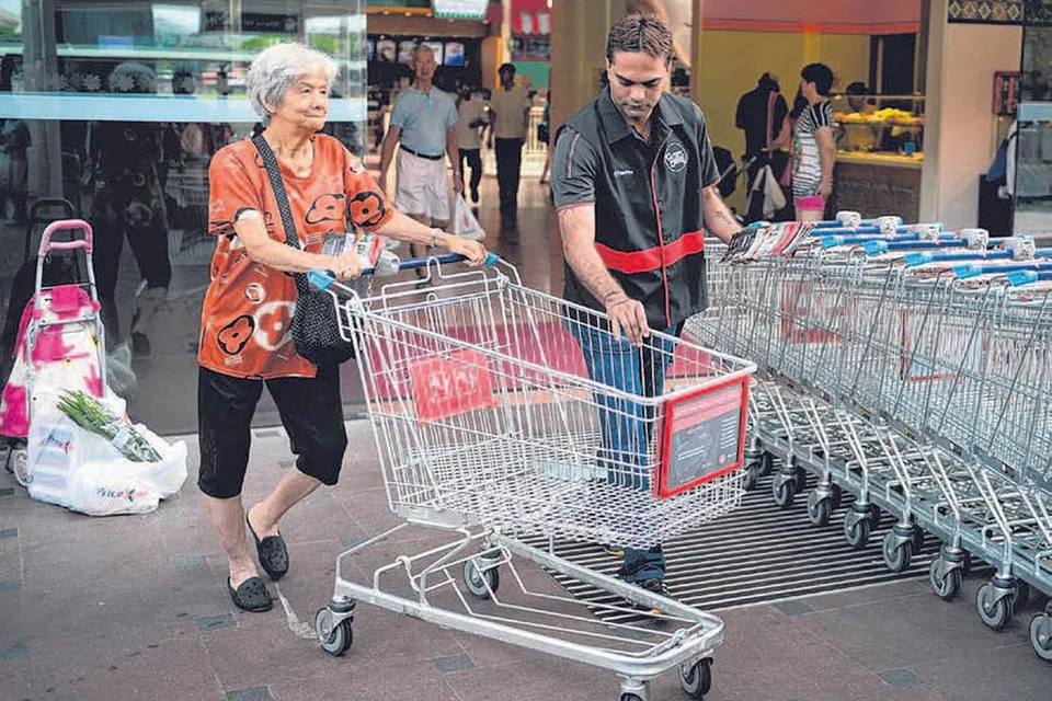 ஜூரோங் பாயிண்ட் ஃபேர்பிரைஸ் பேரங்காடிக்கு வெளியே தள்ளுவண்டி அமலாக்க ஊழியர் கே.சுகுமாறன், 41, ஃபேர்பிரைஸ் வாடிக்கையாளர் தள்ளுவண்டியைத் திருப்பி வைக்க உதவுகிறார். படம்: ஸ்ட்ரெய்ட்ஸ் டைம்ஸ்