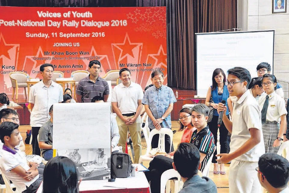 'இளையர்களின் குரல்' என்ற செம்பவாங் குழுத்தொகுதி கலந்துரையாடல் கூட்டம் நேற்று நடந்தது. போக்குவரத்து அமைச்சர் கோ பூன் வான், தற்காலிக கல்வி அமைச்சர் (உயர்கல்வி, திறன்கள்) ஓங் யி காங், அம்ரின் அமின், விக்ரம் நாயர் ஆகியோர் இளையர்களின் கருத்துகளைச் செவிமடுக்கிறார்கள். படம்: பெரித்தா ஹரியான்