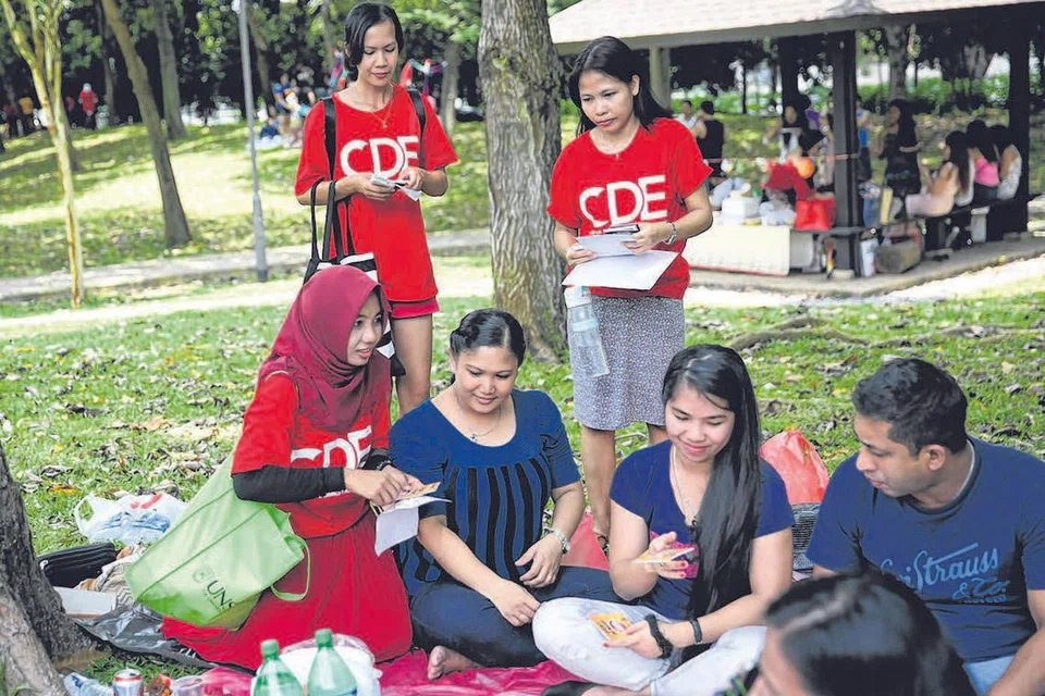தோ பாயோ பூங்காவில் நேற்று காலை கூடிய வெளிநாட்டு இல்லப் பணிப்பெண்களுக்கு ஸிக்கா தொற்று குறித்த கையேடுகள் விநியோகம் செய்யப்பட்டன. படம்: ஸ்ட்ரெய்ட்ஸ் டைம்ஸ்