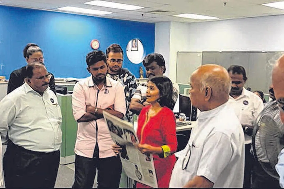 மலாயா பல்கலைக்கழக விரிவுரையாளர் திரு எஸ்.சுப்பிரமணி, தமிழ் நேசன் ஆசிரியர் திரு கே.பத்மநாபன், மக்கள் ஓசை செய்தியாளர் சுரேந்திரன் சுந்தரராஜ், மின்னல் எஃப்.எம் படைப்பாளர் ரவீந்திரன் சண்முகம் ஆகியோர் தமிழ் முரசின் ஆசிரியர் குழுவினருடன் உரையாடுகின்றனர். படம்: எஸ்.பி.பட்டு