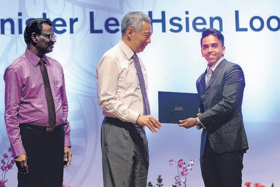சிறப்பு விருந்தினராக வருகையளித்த பிரதமர் லீ சியன் லூங்கிடமிருந்து தேசியப் பல்கலைக்கழக சட்டத் துறை பட்டதாரியான ஹைரூல் ஹக்கீம் சிண்டாவின் உன்னத விருதைப் பெறுகிறார். தலைமைச் சட்ட அதிகாரி அலுவலகத்தில் அரசு வழக்கறிஞராகப் பணிபுரியும் ஹக்கீம் மூன்றாவது முறையாக சிண்டா உன்னத விருது பெறுகிறார். படம்: ஸ்ட்ரெய்ட்ஸ் டைம்ஸ்
