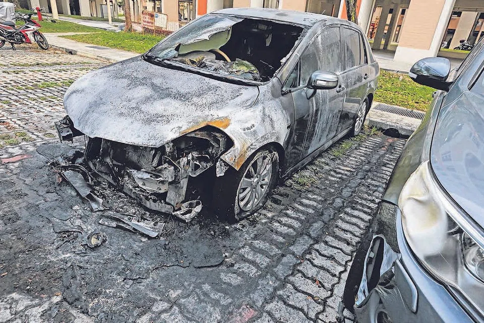 அங் மோ கியோ வட்டாரத்தில் உள்ள கார் நிறுத்துமிடத்தில் திடீரென்று தீப்பிடித்துக்கொண்ட கார் தீக்கு இரையாகி கருகியது. பக்கத்தில் நிறுத்தி வைக்கப்பட்டிருந்த காரும் சேதம் அடைந்தது. படம்: ஷின்மின்