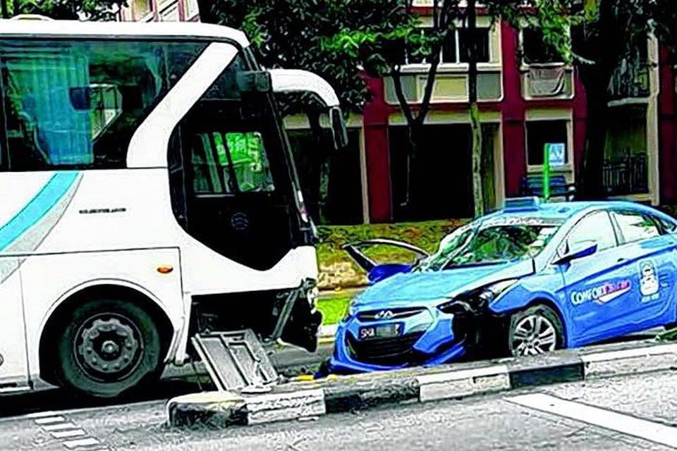 உட்லண்ட்சில் டாக்சி ஒன்றும் தனியார் பேருந்தும் விபத்துக்குள்ளாயின. படம்: ஃபேஸ்புக்