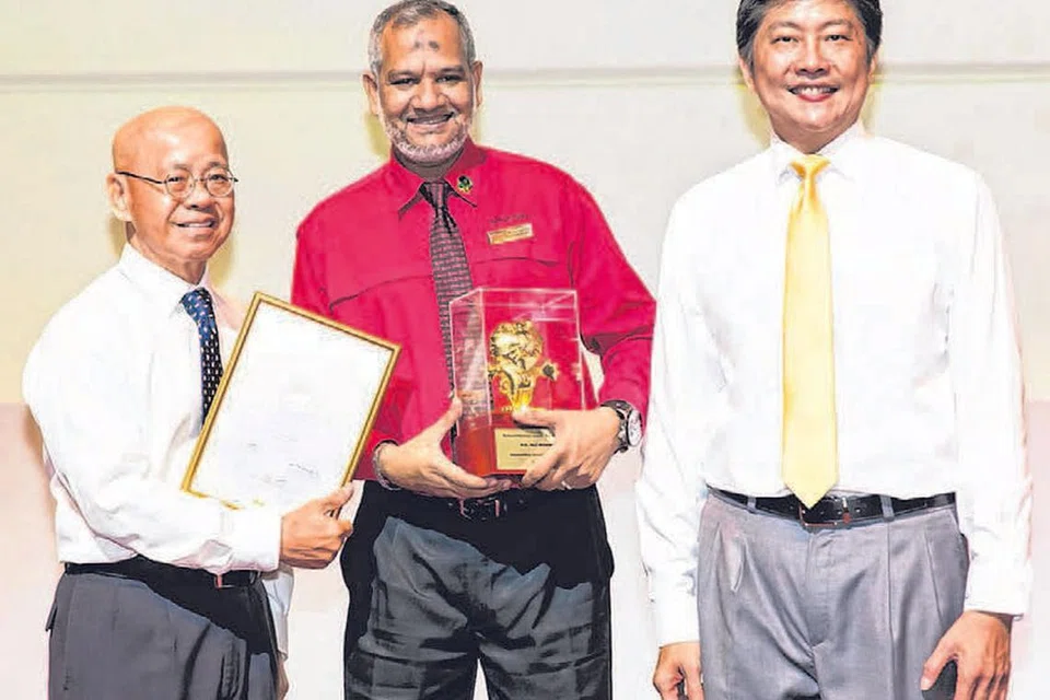 சிங்கப்பூர் கனிவன்பு இயக்கத்தின் பொதுச் செயலாளர் டாக்டர் வில்லியம் வான் (இடது), போக்குவரத்து மூத்த துணை அமைச்சர் இங் சீ மெங் இருவருடன் விருது பெற்ற திரு ஒலி முகம்மது (நடுவில்). படம்: சிங்கப்பூர் கனிவன்பு இயக்கம்