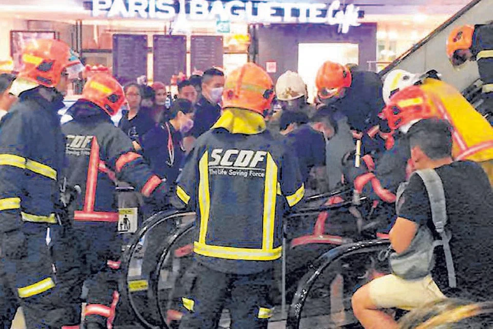 பூகிஸ் ஜங்ஷன் கடைத்தொகுதியில் விசைப்படியில் மாட்டிக் கொண்ட ஆடவர் மீட்கப்படுகிறார். படம்: லியான்ஹ வான் பாவ்