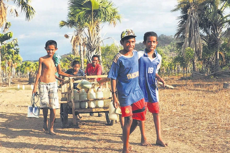 திமோர் லெஸ்டேவில் இந்தப் பையன்கள் ஒரு வண்டி மூலம் குடிநீரைக் கொண்டு வருகிறார்கள். படம்: மெர்சி ரிலீஃப்