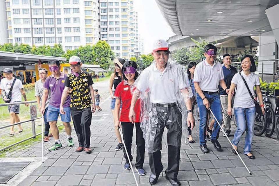 கண்களைக் கட்டிக்கொண்டு வழிகாட்டி உதவியுடன் அமைச்சர் இங் சீ மெங் (வலது) பொங்