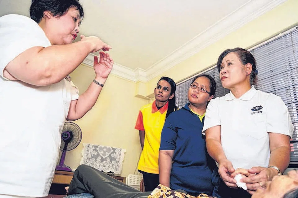 தேசிய நரம்பியல் கழக நரம்பியல் துறையின் மூத்த தாதியர் இவோன் சியூ (இடது), இல்லப் பராமரிப்புத் திட்டத்தின்கீழ் 'பார்கின்சன்ஸ்' நோயாளியின் குடும்பத்தாருக்கு ஆலோசனை கூறுகிறார். என்டியுசி ஹெல்த் சமூக நிறுவனத் தாதியான வசந்தா கிருஷ்ணன் (நடுவில்), அதை உன்னிப்புடன் கவனிக்கிறார். படம்: தேசிய நரம்பியல் கழகம்