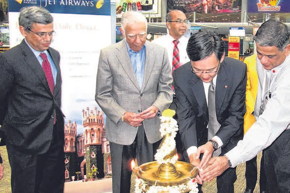 கடந்த புதன்கிழமை அன்று சாங்கி விமான நிலையத்தில் ஜெட் ஏர்வேஸ்ஸின் புதிய சேவையின் தொடக்க விழாவில் கலந்துகொண்ட (இடமிருந்து) சிங்கப்பூருக்கான இந்திய தூதர் ஜாவீத் அஷ்ரஃப் சிங்கப்பூரின் பொதுத் தூதர் திரு திரு கோபிநாத் பிள்ளை, ஆகியோர். படம்: ஜெட் ஏர்வேஸ்