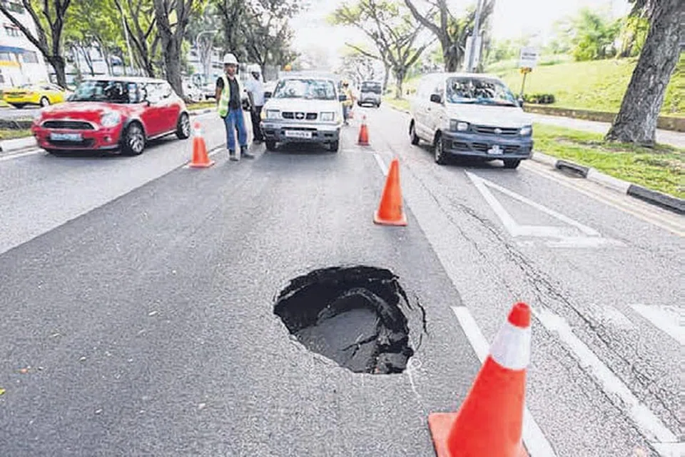அங் மோ கியோ அவென்யூ 5ல், அங் மோ கியோ டெக் பிளேஸ் 1 அருகே நேற்று மாலை 6 மணியள வில் சாலையின் நடுத்தடத்தில் 1 மீட்டர் அகலமுள்ள புதைகுழி ஏற்பட்டது. ஆரஞ்சு நிற கூம்புகளை வைத்து பாதிக்கப்பட்ட பகுதியை ஊழியர்கள் தடுப்பு வேலி இட்டனர். அங் மோ கியோ இன்டஸ்ட்ரியல் பார்க் 2ஐ அடுத்து அங் மோ கியோ அவென்யூ 5ல் இடையூறு இருந்ததாக நிலப் போக்குவரத்து ஆணையம் மாலை 5.57 மணிக்கு டுவிட்டரில் தெரிவித்தது. படம்: ஸ்ட்ரெய்ட்ஸ் டைம்ஸ்