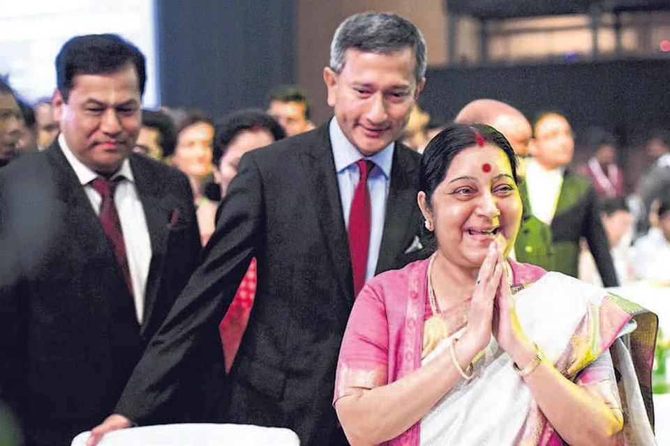 'இந்தியா பிரவாசி பாரதிய திவாஸ்' மாநாட்டில் வெளியுறவு அமைச்சர் டாக்டர் விவியன் பாலகிருஷ்ணன் (நடுவில்), இந்திய வெளியுறவு அமைச்சர் சுஷ்மா சுவராஜ் (வலது). படம்: ஸ்ட்ரெய்ட்ஸ் டைம்ஸ்