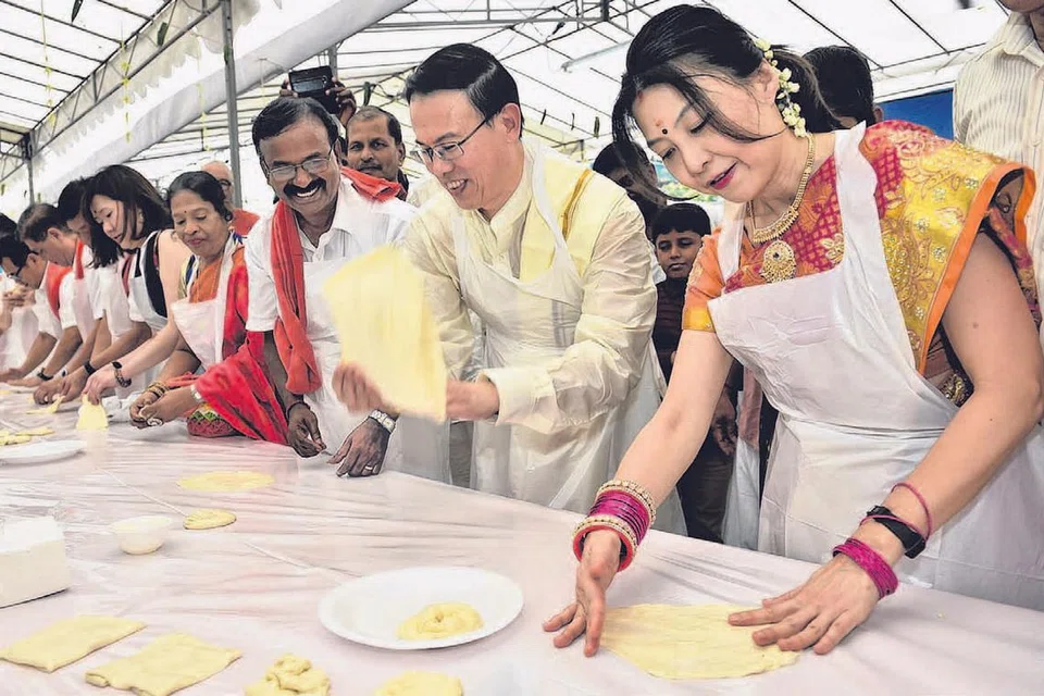 பொங்கல் விழாவில் பங்கேற்றுச் சிறப்பித்த புக்கிட் பாஞ்சாங் குழுத்தொகுதியின் ஆலோசகரும் வடமேற்கு சமூக மேம்பாட்டு மன்ற மேயருமான டாக்டர் டியோ ஹோ பின்னும் மற்றவர்களும் பரோட்டா சாதனை படைத்து மகிழ்கின்றனர். படம்: புக்கிட் பாஞ்சாங் சமூக மன்றம்