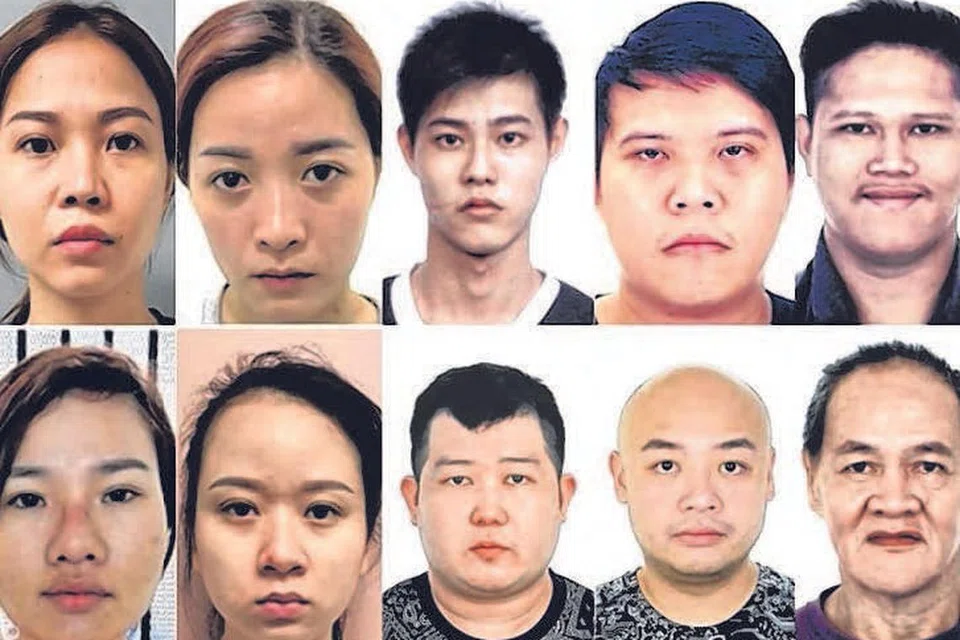 மோசடி கும்பல்: (மேலே வலமிருந்து) நுயென் தி கிம் பா, ஹோ தி பி பா, சோய் யோங் ஹுவி எல்விசன், வோங் கியன் மன், சான் டெங் செங், காங் ஆ ஹோக், ஏட்ரியன் கின் ஷெங் கியட், லியு ஜியான்வெய் ஆண்ட்ரு, வோ தி ஙோ தாவ், நுயென் தி பிச் டான். படம்: குடிநுழைவு, சோதனைச் சாவடி ஆணையம்