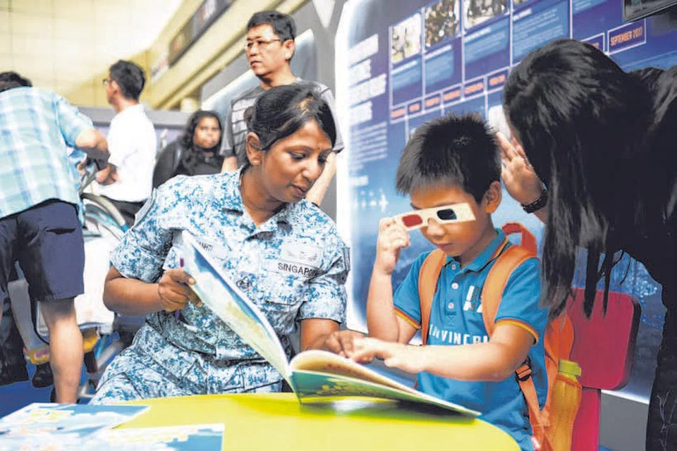 சிங்கப்பூர் குடியரசு ஆகாயப்படை வீரரான 'எம்இ3' சாந்தி தனபால், நேற்று தோ பாயோவில் நடைபெற்ற கண்காட்சிக்கு வந்திருந்த சிறுவனுக்கு ஆகாயப் படையின் நடவடிக்கை நூலில் உள்ள முப்பரிமாண படத்தைக் காண்பிக்கிறார். படம்: தற்காப்பு அமைச்சு