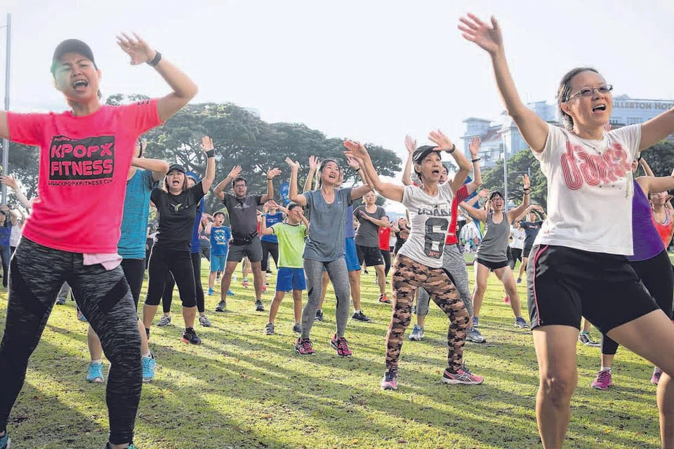 குடிமை வட்டாரத்தில் கார்கள் இல்லாத ஞாயிற்றுக்கிழமையின் போது இடம்பெற்ற பல்வேறு நடவடிக்கைகளில் பலரும் கலந்துகொண்டனர். அத்தகைய நடவடிக்கைகளில் ஒன்றான உடலுறுதி பயிலரங்கு ஒன்றில் தாளத்திற்கு ஏற்ப உடற்பயிற்சியில் இவர்கள் ஈடுபட்டனர். படம்: ஸ்ட்ரெய்ட்ஸ் டைம்ஸ்