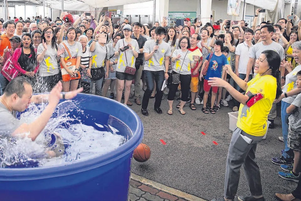 'சிடிஎல்' குழும தலைமை நிர்வாக அதிகாரி ஷெர்மன் குவெக் நீர்த்தொட்டிக்குள் விழுந்து வேடிக்கை காட்டுவதை அங்கு திரண்டிருந்த ஏராளமான பார்வையாளர்கள் ரசித்தனர். படம்: ஸ்ட்ரெய்ட்ஸ் டைம்ஸ்