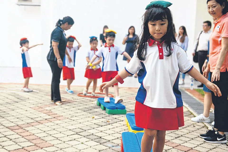 அங் மோ கியோவில் உள்ள மக்கள் செயல் கட்சி அறநிறுவனத்தின் ஸ்பார்க்கல்டாட்ஸ் பாலர் பள்ளி மாணவர்கள் உடற்பயிற்சியில் ஈடுபடுத்தப்படுகின்றனர். அத்துடன் அப்பள்ளியில் ஆரோக்கிய உணவுகளும் மாணவர்களுக்குப் பரிமாறப்படுகின்றன. படம்: ஸ்ட்ரெய்ட்ஸ் டைம்ஸ்