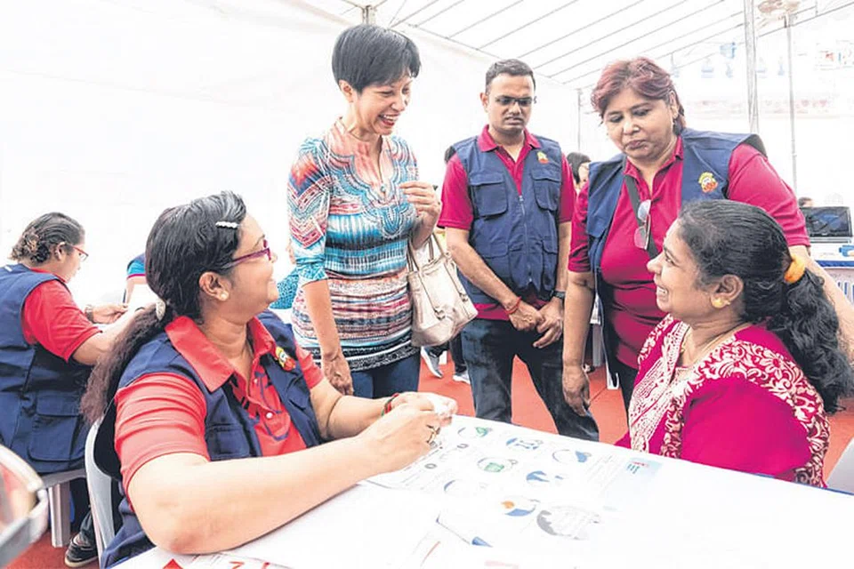 பிரதமர் அலுவலக அமைச்சர் இந்திராணி ராஜா (இடமிருந்து மூன்றாவது) சுகாதாரப் பரிசோதனைகள் செய்யும் பொதுமக்களோடும் தொண்டூழியர்களோடும் கலந்துரையாடுகிறார்.