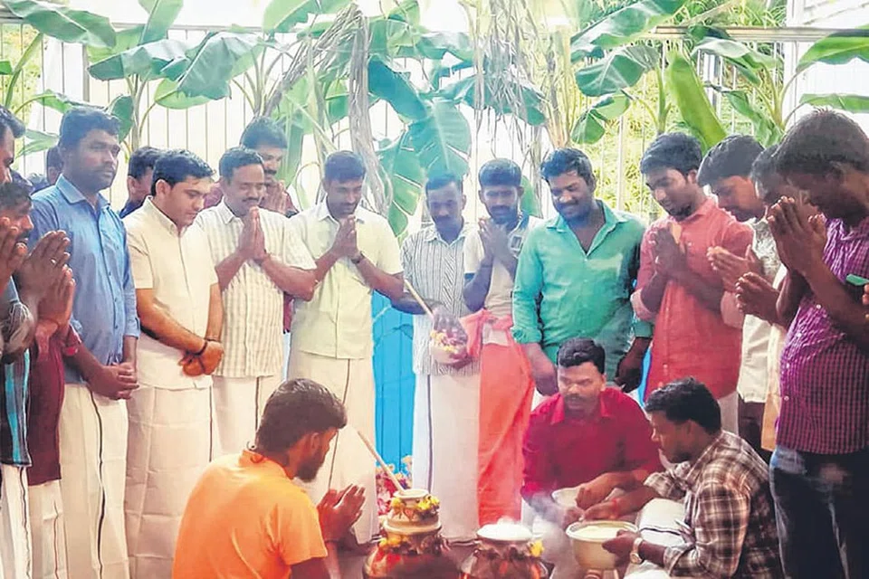 'தி லியோ' தங்கும் விடுதியின் வெளிநாட்டு ஊழியர்கள் பால் பொங்கி வருவதைப் பார்த்து வழிபடுகின்றனர். படம்: எம்இஎஸ் குழுமம்