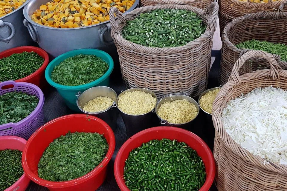 கிட்டத்தட்ட 10,000 பக்தர்களுக்கு உணவு தயாரிக்கத் தேவைப்படும் காய்கறிகள். படம்: அருள்மிகு தெண்டாயுதபாணி கோயில். -