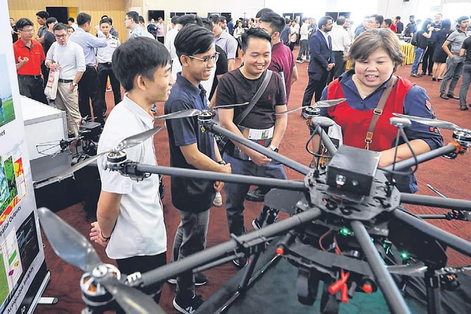 தொழில்நுட்பக் கல்விக் கழக மத்திய கல்லூரியில் நேற்று நடைபெற்ற ஆளில்லா வானூர்தி கண்காட்சியில் பங்கேற்பாளர்கள் அங்கு வைக்கப் பட்டிருந்த பல்வேறு விதமான வானூர்திகளைப் பார்வையிட்டனர். படம்: ஸ்ட்ரெய்ட்ஸ் டைம்ஸ் -