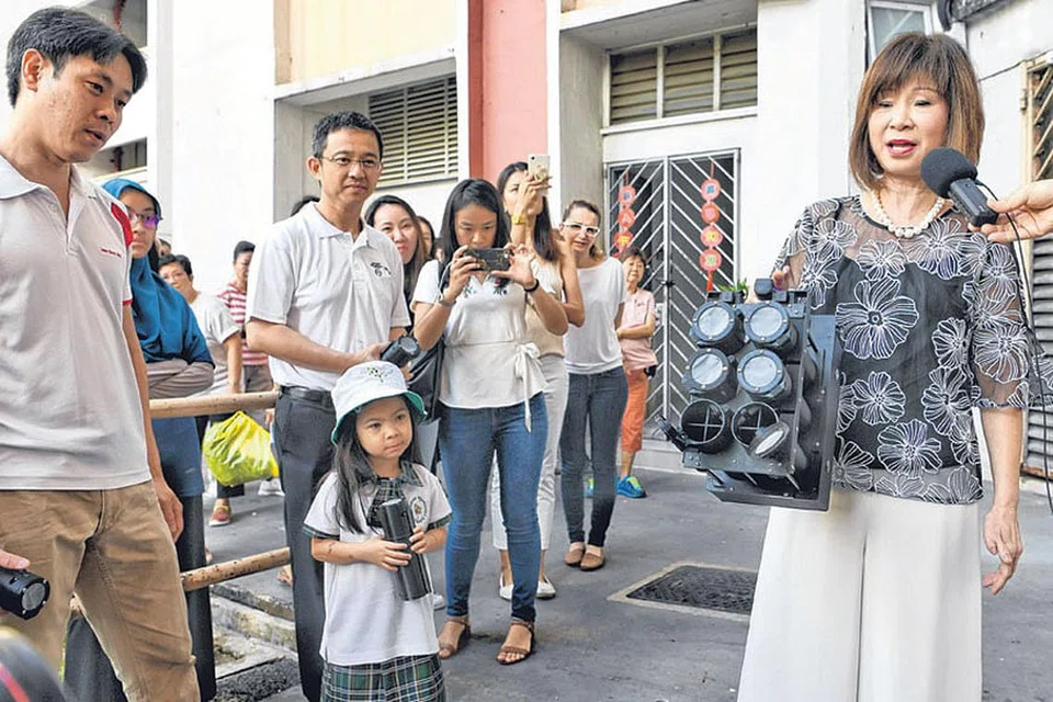 நீ சூன் ஈஸ்ட் தொகுதி நாடாளுமன்ற உறுப்பினர் லுயிஸ் இங் (இடக்கோடி), அவரது மகள் எல்லா இங், தேசிய சுற்றுப்புற வாரியத்தின் தலைவர் டான் மெங் டுயி ஆகியோர் முன்னிலையில் சுற்றுப்புற, நீர்வள மூத்த துணை அமைச்சர் ஏமி கோர் (வலது) ஆகியோர் 'வொல்பாக்யா-ஏடிஸ் எஜிப்டி' நேற்று கொசுக்களை விடுவித்தனர். படம்: ஸ்ட்ரெய்ட்ஸ் டைம்ஸ் -