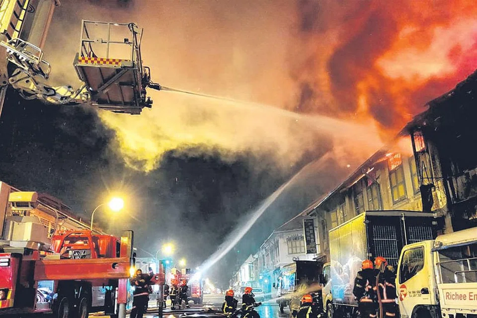 எண் 643 கேலாங் ரோடு முகவரியில் நேற்று அதிகாலை நேரத்தில் மூண்ட தீயில் ஏழு கடைவீடுகள் அழிந்துவிட்டன. 60 தீயணைப்பாளர்கள் 3 மணி நேரம் போராடி அதிகாலை 5 மணிக்குத் தீயை அணைத்தனர். இந்தத் தீ விபத்து பற்றி சிங்கப்பூர் குடிமைத் தற்காப்புப் படை நேற்று அதிகாலை 1.47 மணி முதல் ஃபேஸ்புக்கில் பல விவரங்களைத் தெரிவித்து காணொளிகளையும் பதிவேற்றி வந்தது. இந்தத் தீ விபத்தில் யாருக்கும் காயம் இல்லை. மொத்தம் 17 அவசரகால வாகனங்களும் தீயை அணைக்க உதவின. படம்: ஃபேஸ்புக்/சிங்கப்பூர் குடிமைத் தற்காப்புப் படை