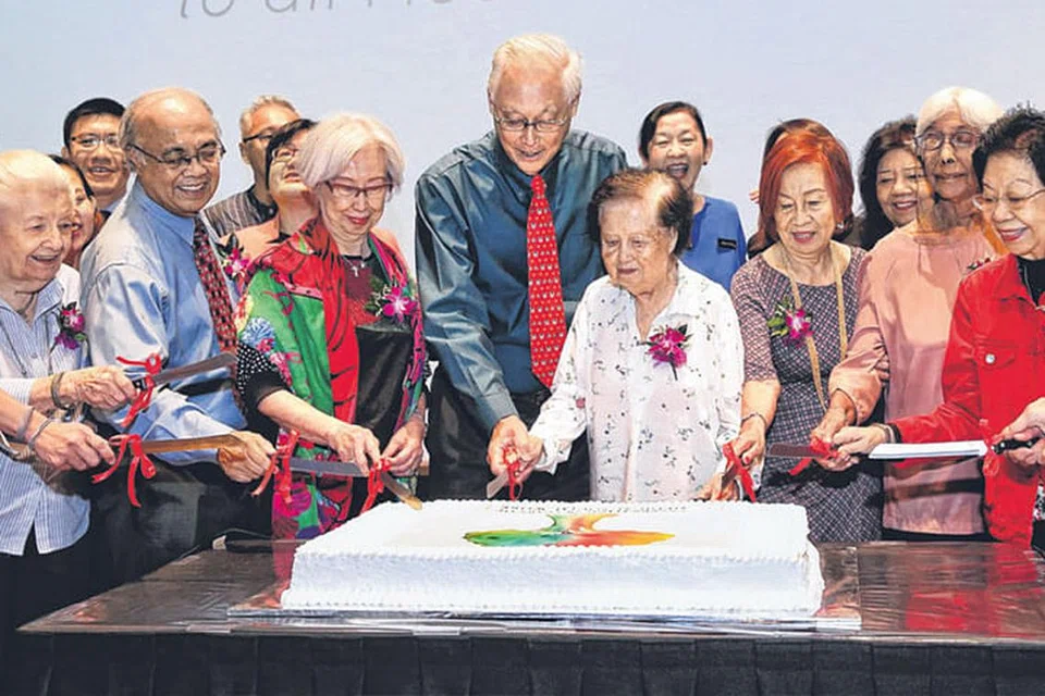 நிகழ்ச்சியில் அந்தச் சேவை முன்னோடிகளுடன் ஓய்வு பெற்ற கௌரவ மூத்த அமைச்சர் கோ சோக் டோங் கேக் வெட்டி மகிழ்ந்தார். படம்: ஸ்ட்ரெய்ட்ஸ் டைம்ஸ்